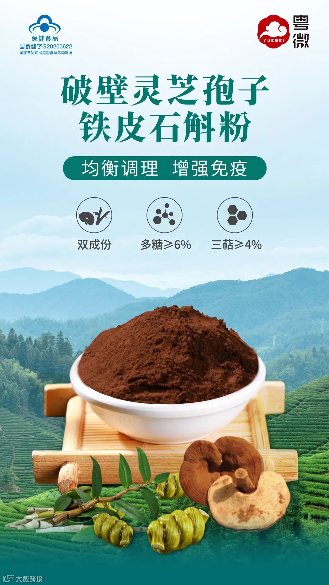 ③破壁灵芝孢子铁皮石斛粉——汇聚中华两大仙草,考究选材,精准锁定3年生贵州赤水铁皮石斛,以及粤微专属菌种“云顶芝”,阴阳双调,每100g含:粗多糖6g、总三萜4g。经动物实验评价,具有增强免疫力的保健功效。