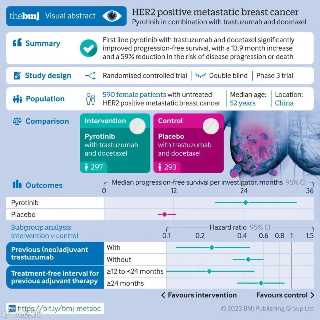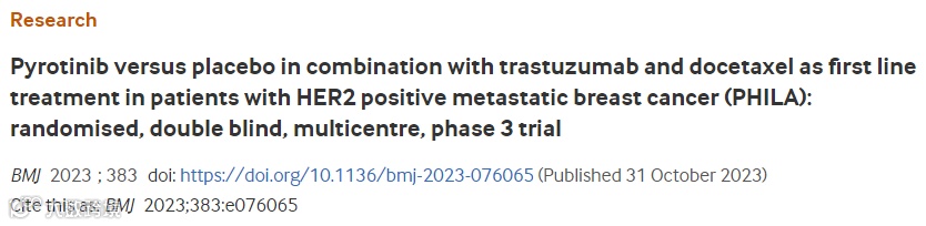 参考文献: [1] Fei Ma et al. Pyrotinib versus placebo in combination with trastuzumab and docetaxel as first line treatment in patients with HER2 positive metastatic breast cancer (PHILA): randomised, double blind, multicentre, phase 3 trial. THE BMJ (2023).