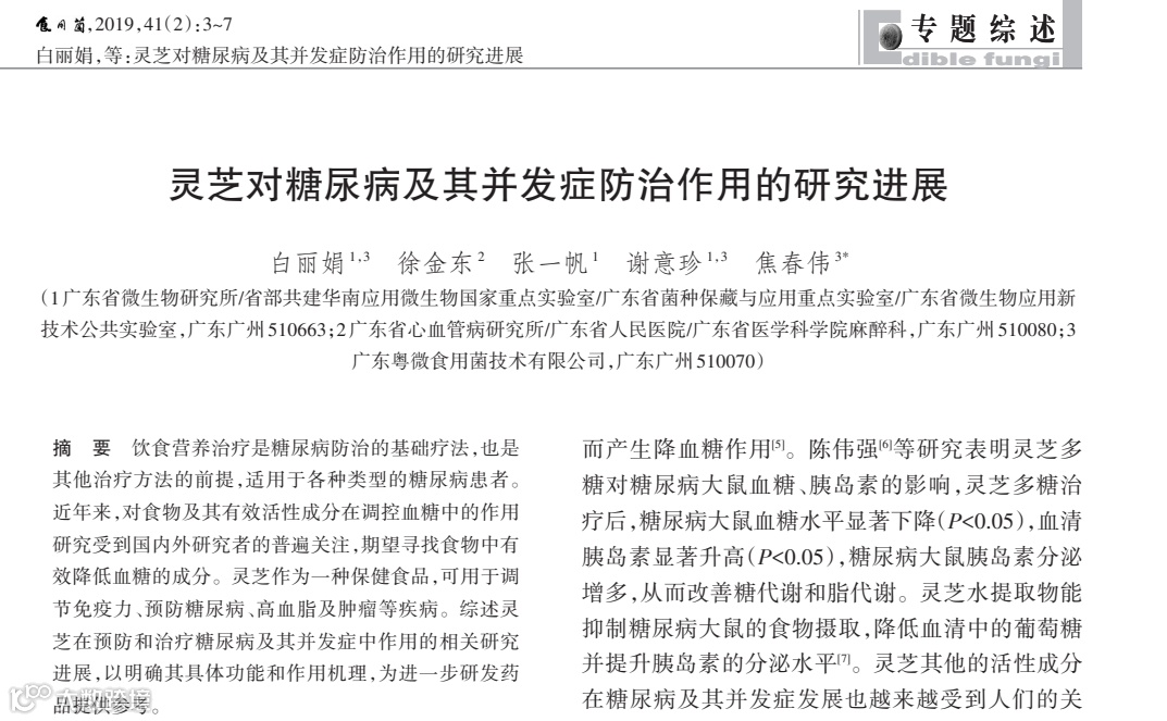 2019年,广东省科学院微生物研究所、广东粤微食用菌技术有限公司白丽娟科研团队发布《灵芝对糖尿病及其并发症防治作用的研究进展》,揭示灵芝作为一种保健食品,可用于调节免疫力、预防糖尿病、高血脂及肿瘤等疾病。综述灵芝在预防和治疗糖尿病及其并发症中作用的相关研究进展,以明确其具体功能和作用机理,为进一步研发药品提供参考。
