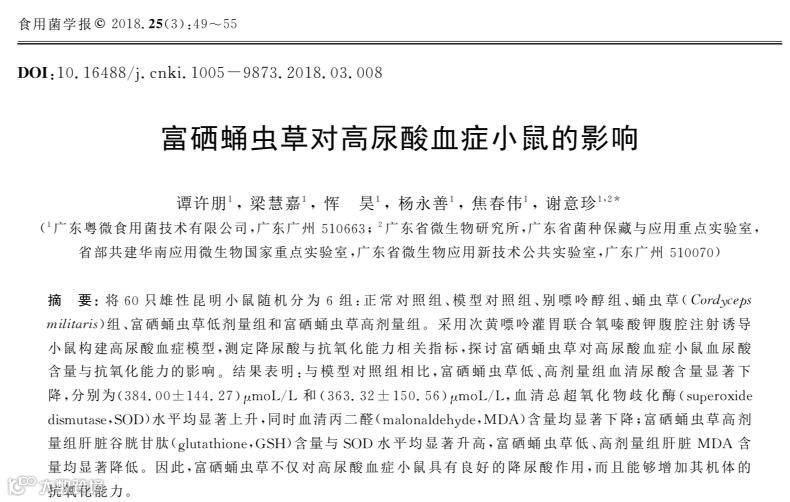 2018年,广东省科学院微生物研究所、广东粤微食用菌技术有限公司谭许朋科研团队发现富硒蛹虫草不仅对高尿酸血症小鼠具有良好的降尿酸作用,而且能够增加其机体的抗氧化能力。