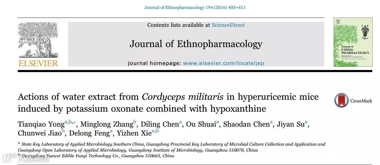 参考文献:Yong, T., Zhang, M., Chen, D., Ou, S., Chen, S., & Su, J., et al. (2016). Actions of water extract from cordycepsmilitaris, in hyperuricemic mice induced by potassium oxonate combined with hypoxanthine. Journal of Ethnopharmacology, 194, 403–411.