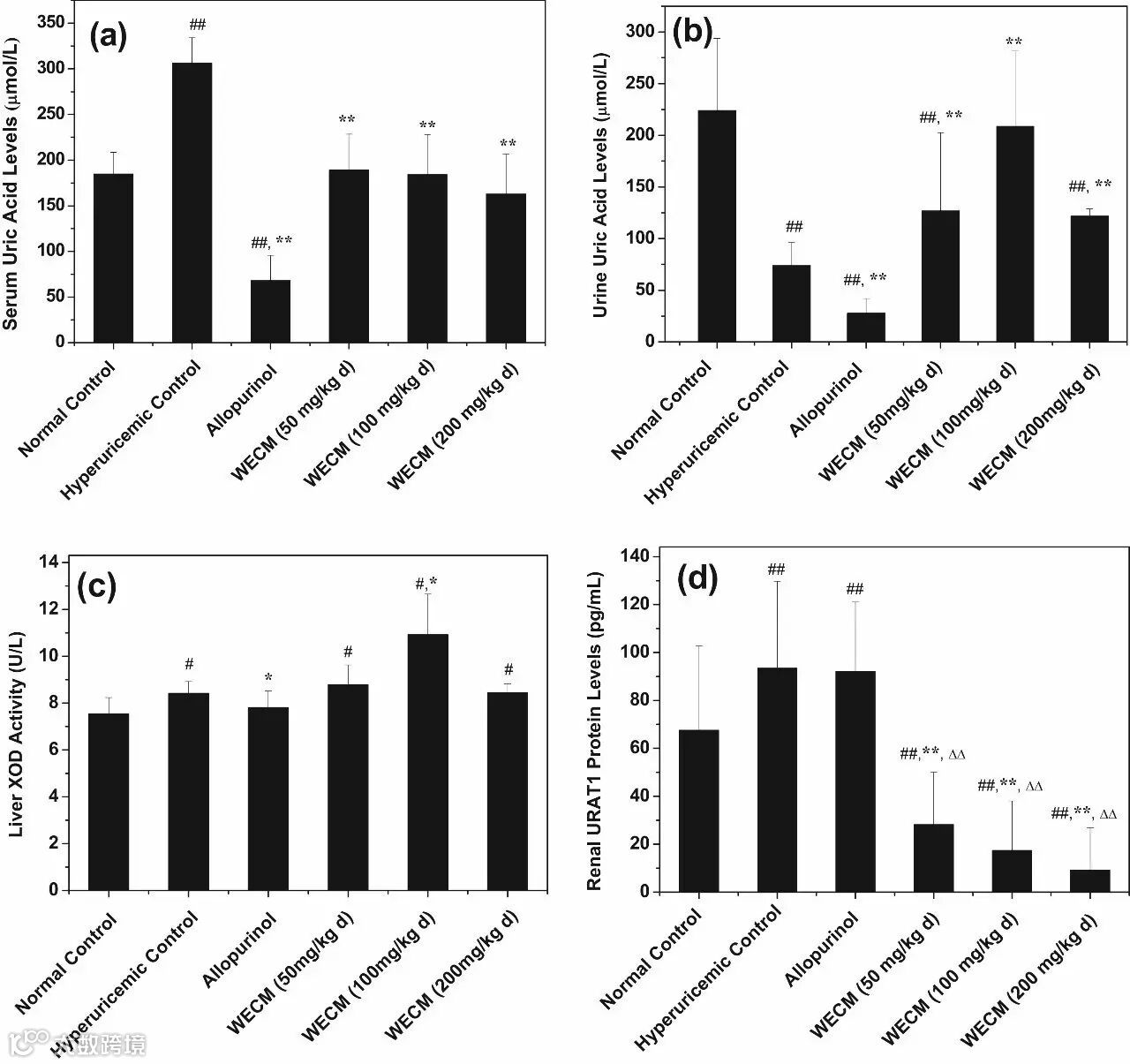 图1 从左至右分别是正常组、高尿酸模型组、别嘌醇(Allopurinol)阳性对照组、蛹虫草活性提取物(WECM)不同剂量组,(a)、(b)、(c)、(d)对应小鼠血清尿酸值、尿中尿酸值、肝脏XOD酶活性、肾URAT1蛋白水平。
