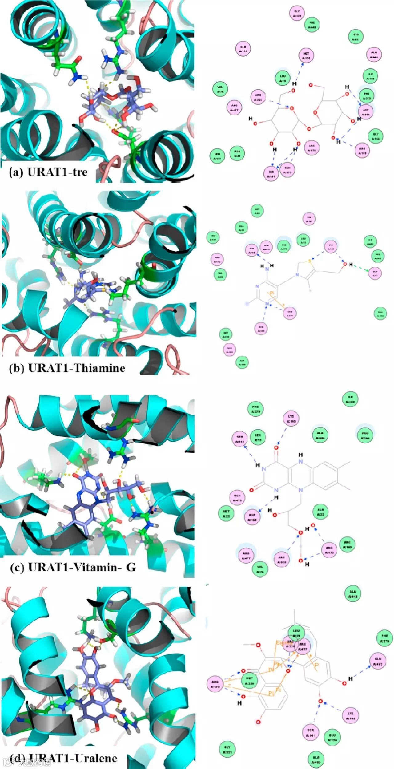 作者对URAT1进行同源建模,用拉氏构象图验证,再用分子对接的方法从自建的蛹虫草化学成分数据库中筛选URAT1蛋白模型合适配体。配体经MM-GBSA方法预估配体结合能,经过筛选,作者找出排在前4的合适配体。