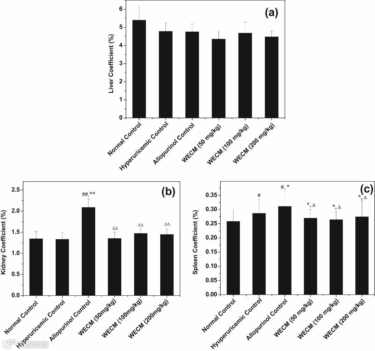图3 从左至右分别是正常组、高尿酸模型组、别嘌醇(Allopurinol)阳性对照组、蛹虫草活性提取物(WECM)不同剂量组,(a)、(b)、(c)分别代表小鼠肝脏指数、肾脏指数、脾脏指数