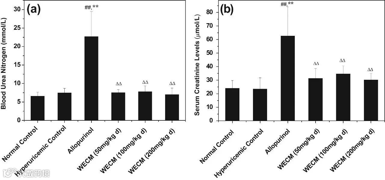 图2 从左至右分别是正常组、高尿酸模型组、别嘌醇(Allopurinol)阳性对照组、蛹虫草活性提取物(WECM)不同剂量组,(a)是小鼠血尿氮含量值(b)为小鼠血清肌酐(Cr)含量值