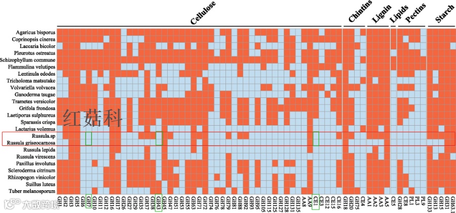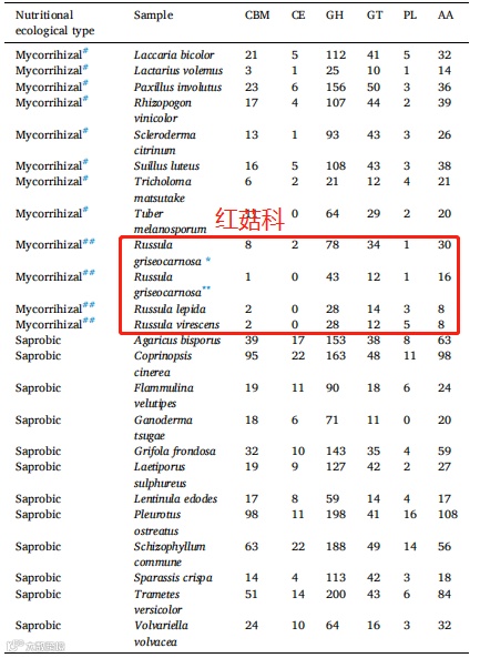据悉,正常情况下,真菌会分泌一系列碳水化合物活性酶(CAZymes),反映它们对栖息地相关底物的特殊利用。但研究结果发现,灰肉红菇碳水化合物活性酶(CAZymes)的分布与其他菌根真菌如松茸、牛肝菌(均是难以人工栽培的品种)相似,其数量和种类较腐生菌而言偏少,特别是碳水化合物结合模块(CBMs)和碳水化合物脂酶(CEs)。