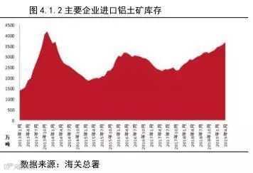 国内延续打击非法采矿行动,山西河南间断性的进行专项整顿行动,导致国内铝土矿供应紧张,铝土矿价格稳步上涨,铝硅比5的国产铝土矿到厂不带票价格涨至500元/吨左右,氧化铝企业进行工艺改造试用进口矿的范围有所扩大,铝土矿进口量屡创新高。进口铝土矿库存持续增加至3700万吨,试用国产铝土矿的氧化铝企业库存量已恢复至20-30天,铝土矿供应平稳不会影响到国内氧化铝企业的生产情况。