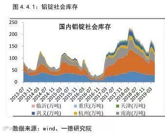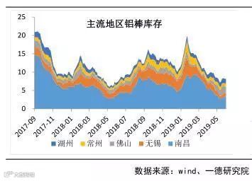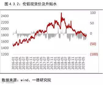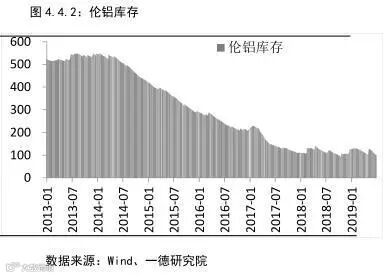 铝锭出库量表现中规中矩而铝锭社会库存明显去库有两方面原因,一是铝水直接生产成铝棒厂对厂供应下游,省去了铝棒或者铝锭进入社会库存的环节,二是市场供需矛盾较为突出,供小于求导致被动去库,春节后随着下游需求复苏去库开始。截止2019年6月底,铝锭社会库存约105万吨,从3月中旬库存最高175万吨算起,库存下降了70万吨,下降幅度约40%,高于去年同期15个百分点,且高于2014-2017年同期去库存平均值16个百分点。目前行业利润难见明显恢复迹象,供应端未见加速供给的动力,导致电解铝供应难有增速,铝锭库存被动去库,此现象或将持续,加之政策对基建等下游消费的刺激,下半年铝锭持续去库化过程。LME铝库存整体保持下滑态势,目前已跌破100万吨库存。