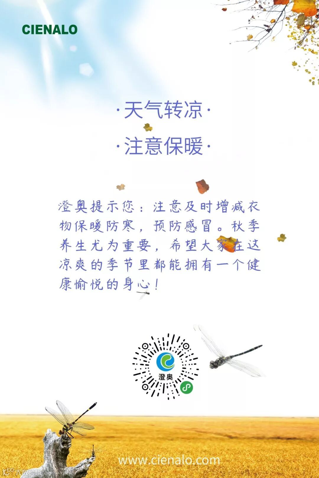 一场秋雨,一场凉,秋雨过后天气温度逐渐下降, 澄奥提示您:注意及时增减衣物保暖防寒,预防感冒。秋季养生尤为重要,希望大家在这凉爽的季节里都能拥有一个健康愉悦的身心!