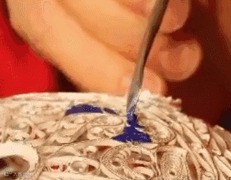 烧蓝 是将整个胎体填满色釉后,再拿到炉温大约800℃的高炉中烘烧,色釉由砂粒状固体熔化为液体,待冷却后成为固着在胎体上的绚丽的色釉,此时色釉低于铜丝高度,所以得再填一次色釉,再经烧结,一般要连续四五次,直至将纹样内填到与掐丝纹相平。