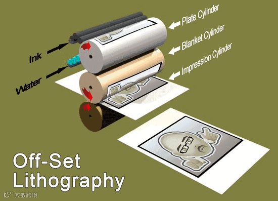 平版印刷 由于平版印刷上的图文部分与非图文部分处于同一个平面上,在印刷时,为了能使油墨区分印版的图案部分还是非图案部分,利用油水分离的原理,首先由印版部件的供水装置向印版的非图文部分供水,从而保护了印版的非图文部分不受油墨的浸湿。然后,由印刷部件的供墨装置向印版供墨,由于印版的非图文部分受到水的保护,因此,油墨只能供到印版的图文部分。最后是将印版上的油墨转移到乳皮上,再利用橡皮滚轮与压印滚筒之间的压力,将乳皮上的油墨转移到承印物上,完成一次印刷,所以,平版印刷是一种间接的印刷方式。
