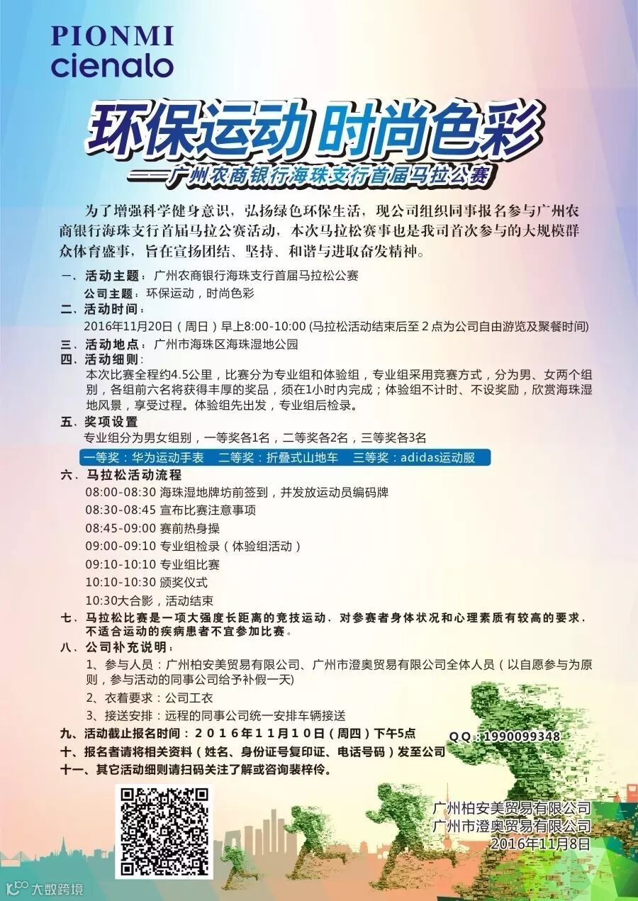 二、活动时间:2016年11月20日(星期天)早上:8.30-10:00 (马拉松活动结束后至2点为公司自由游览及聚餐时间)
