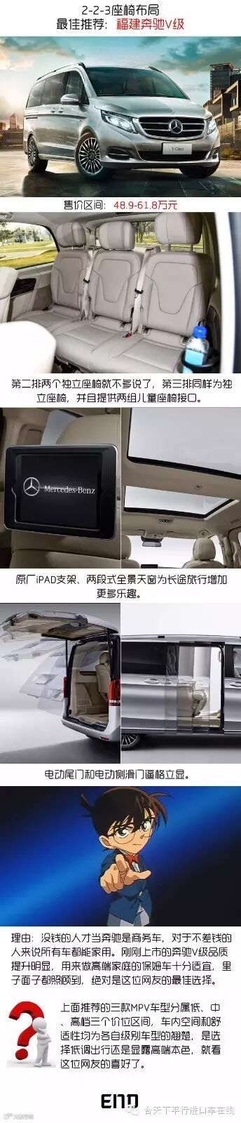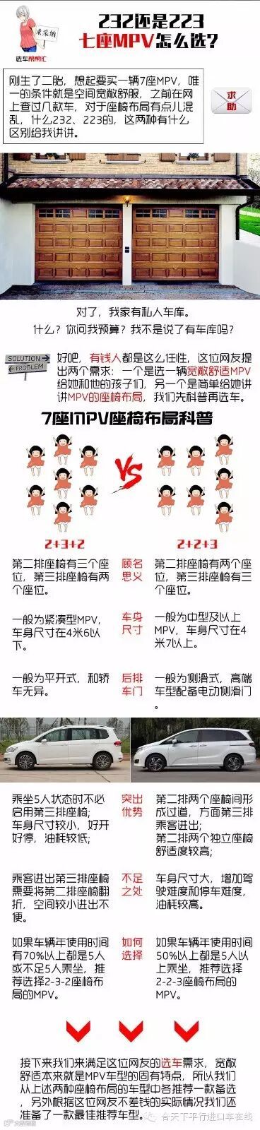 位神秘网友的选车需求,根据言语判断应该是位大嫂,她想买一辆7座MPV,唯一的要求是宽敞舒适,但没有透露具体预算,同时要求我们为她介绍一下7座MPV两种座椅布局的差别。来自网络