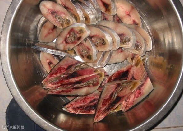 好啦,刚才不是把鱼块分类放的吗?那把带有鱼肚子的,还有鱼头都洗干净吧!放到一起,做好准备。