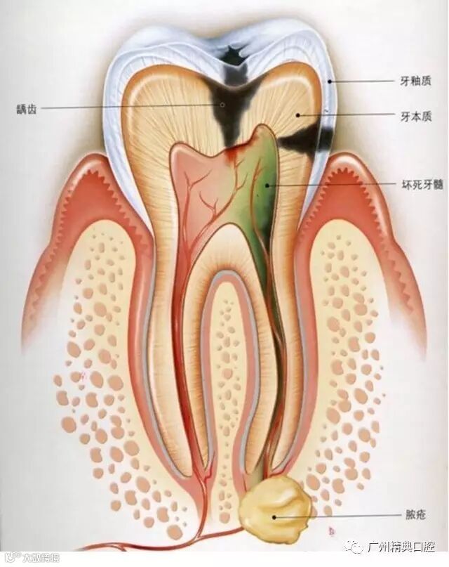 我们可以看到牙齿内部是中空的结构,里面装着牙髓,包括了神经、血管、浸润细胞等。 这个空腔的结构就是广义上的根管。牙髓感染会导致疼痛、肿胀,影响进食和日常生活。拖延不治疗甚至会导致脸部组织感染,肿胀。长期置之不顾会突破面部皮肤形成皮瘘。这就是你蛀牙后期为什么会疼的原因。