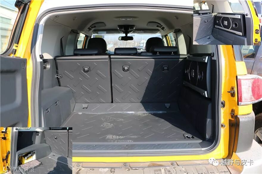 而顶配版的左边是一个放置工具包和千斤顶的储物盒,右边则是JBL音响的低音炮