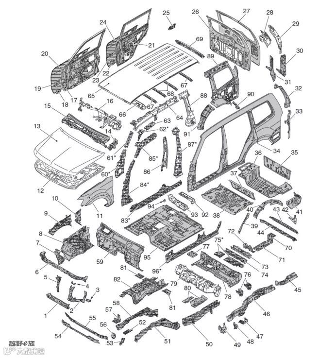 通过下方的底盘结构拆解图我们不难发现,帕杰罗的一体式车身大量采用了耐腐蚀的高强度钢板,在刚性比较薄弱的驾驶区域还采用了高达590MPa的超高强度钢板。图示就是最好的证明,其中灰色部分是耐腐蚀结构,划线部分为高强度钢板结构,而带有“*”标注的则是指590MPa超高强度钢板。