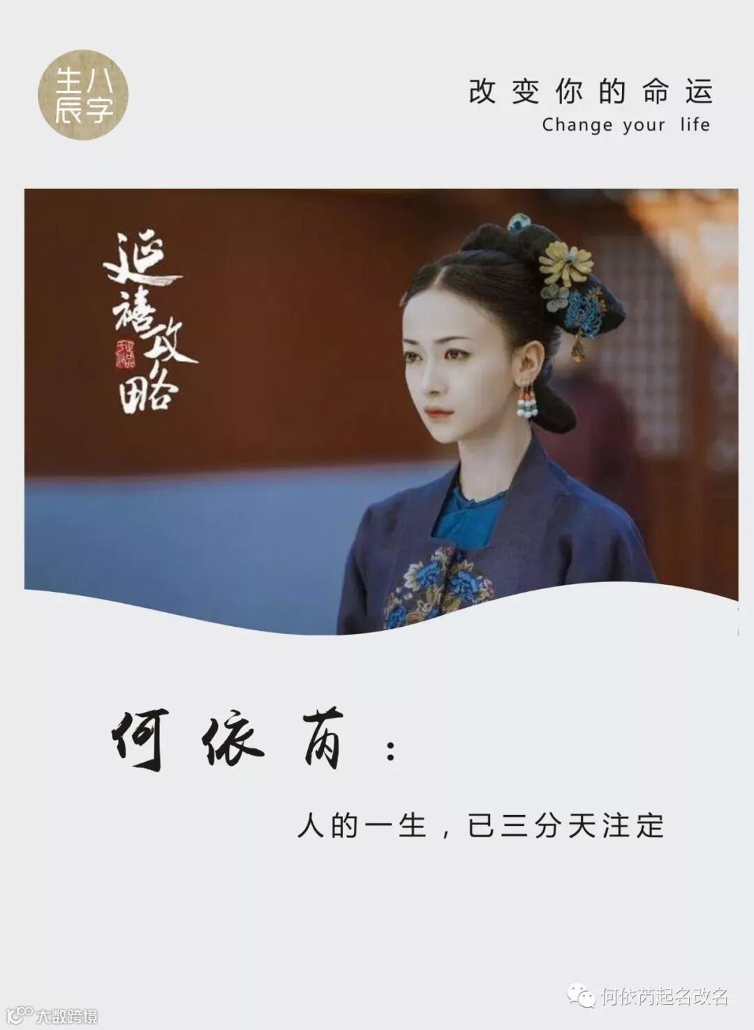 从何老师的五格算法就已经看出魏璎珞的不平凡身世,先天的运势(天格)以及足智多谋(人格)是她成功的基石,从满洲包衣的身份到令妃的身份变换足以说明这点。而大结局是在她巅峰时期之后的,因此从青年(地格、外格、总格)开始便可推测剧情结尾。