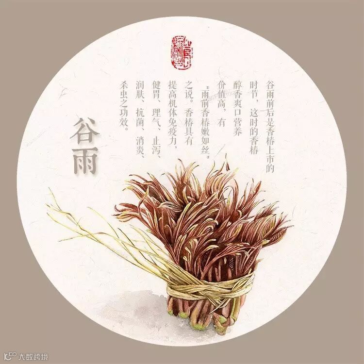 北方谷雨食香椿习俗,谷雨前后是香椿上市的时节,这时的香椿醇香爽口营养价值高,有“雨前香椿嫩如丝”之说。