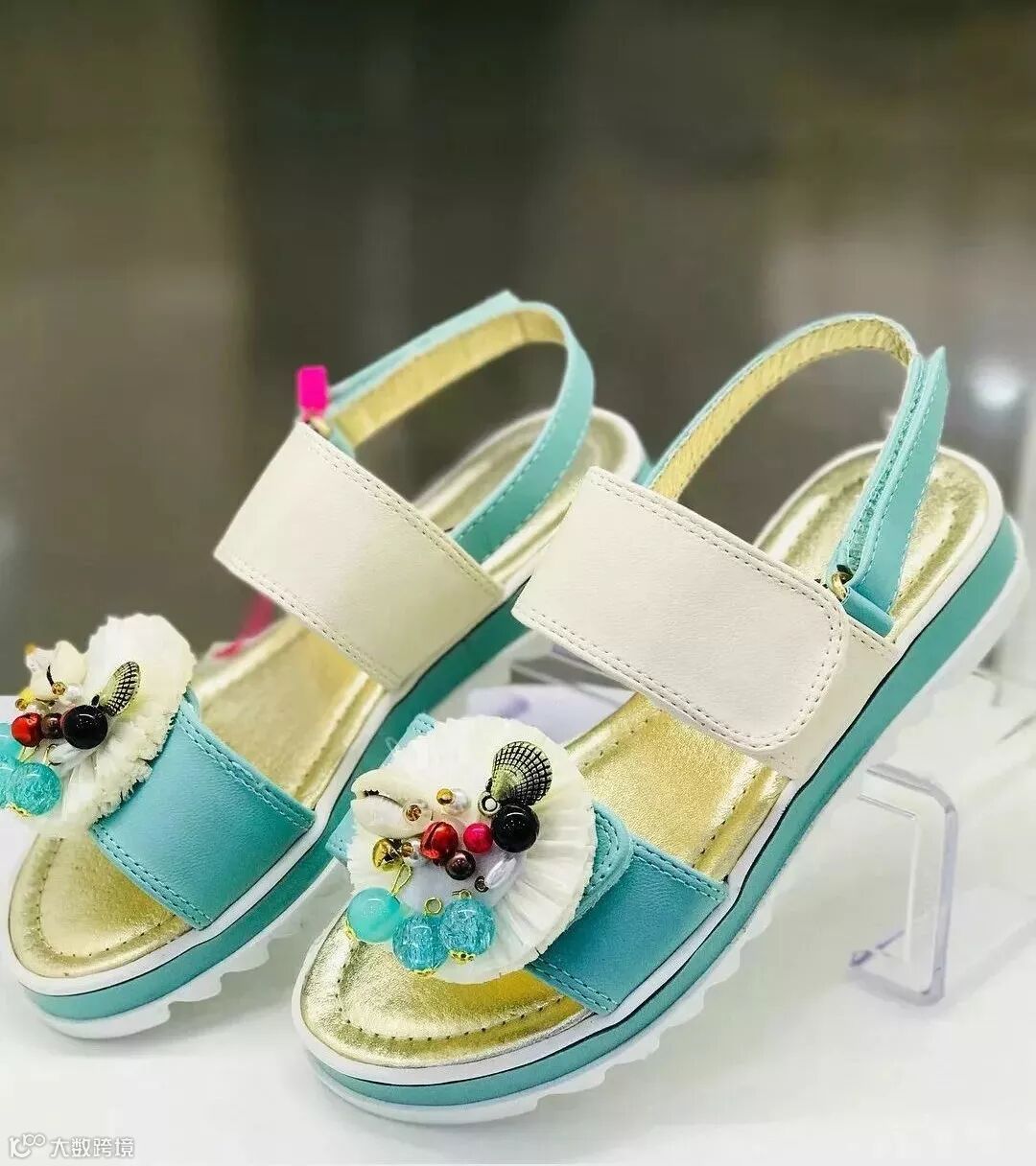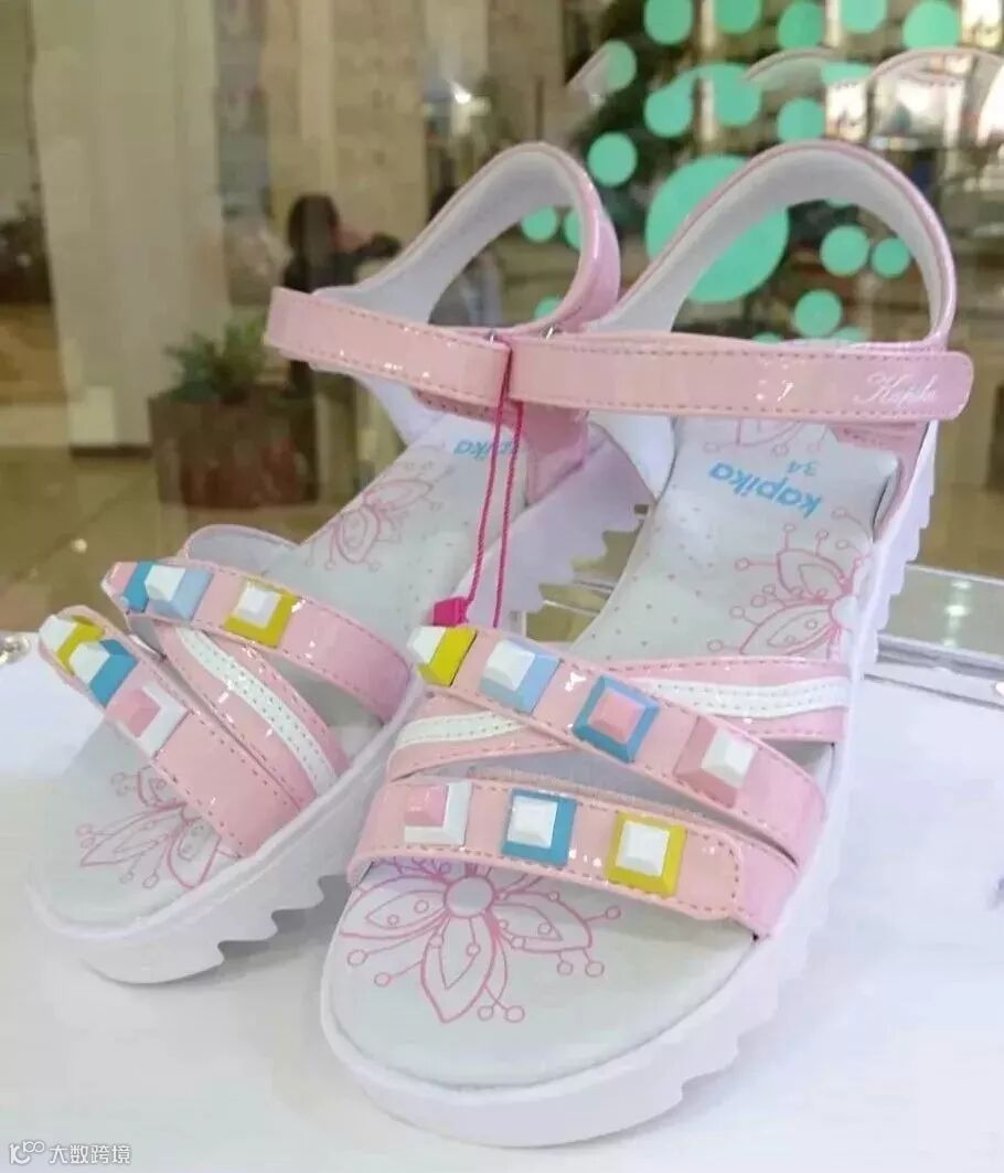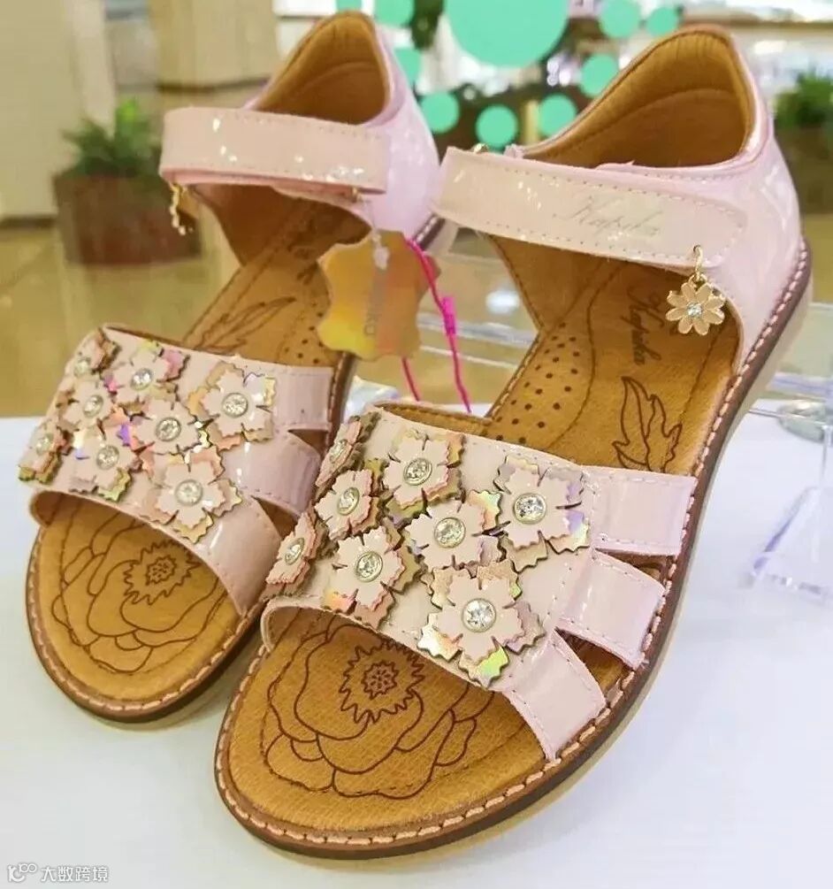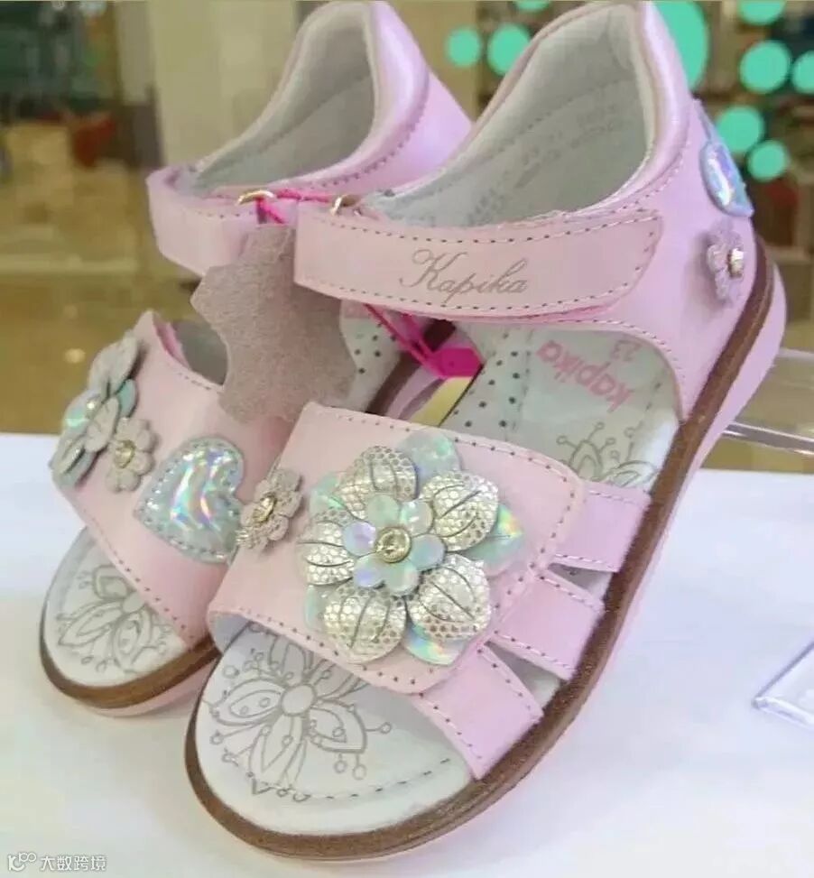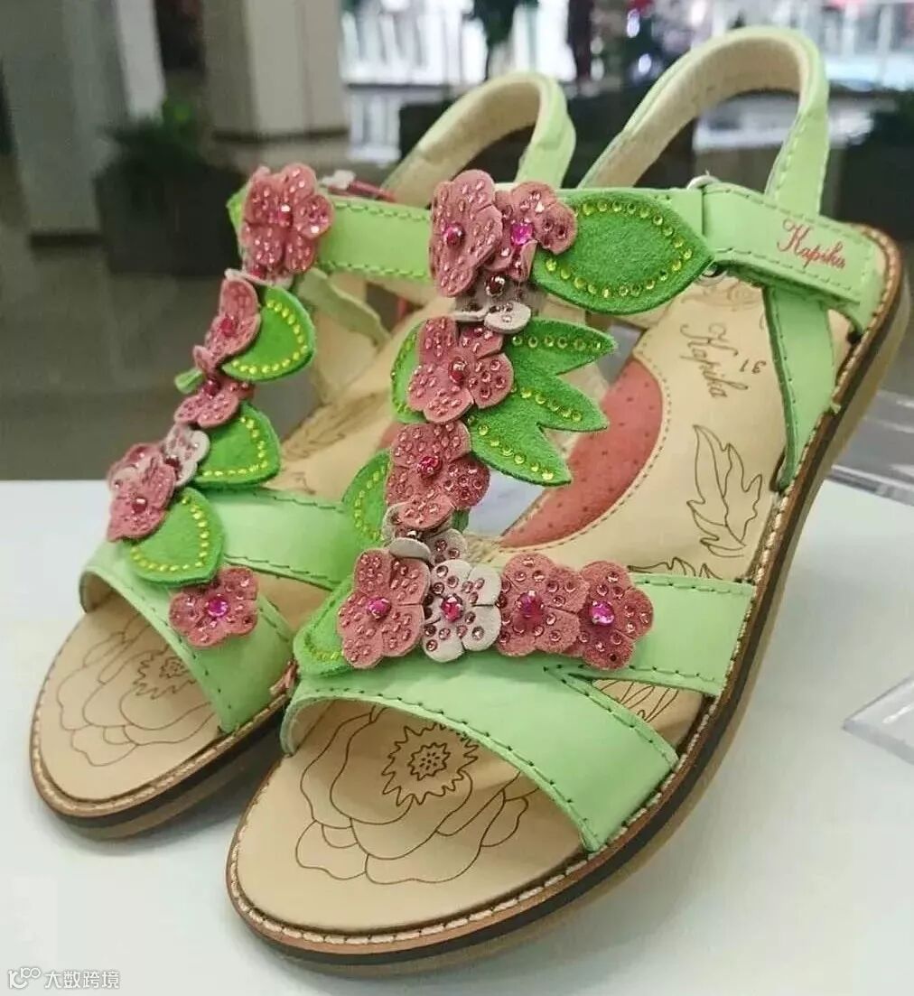 色彩靓丽的条带凉鞋,在俄罗斯童鞋市场上十分走俏,温柔系配色、串珠饰扣、立体花设计完美契合孩童审美。