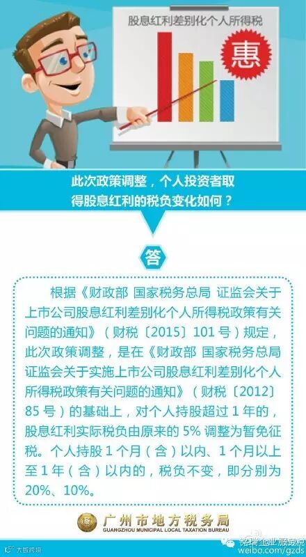 答:此次政策调整,在财税〔2012〕85号文基础上,对个人持股超过1年的,股息红利实际税负由原来的5%调整为暂免征税。个人持股1个月(含)以内、1个月以上至1年(含)以内的,税负不变,即分别为20%、10%。