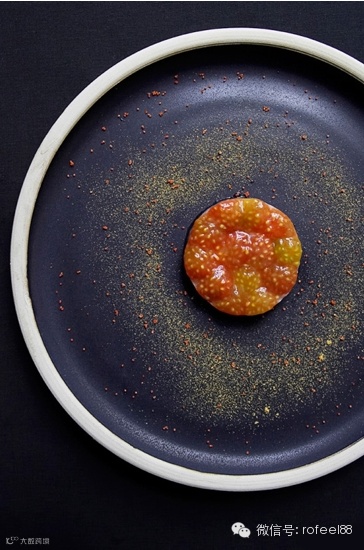 大西洋小龙虾卵点缀番茄,又是一个同心圆的摆盘方式,与黑色的盘子特别配。