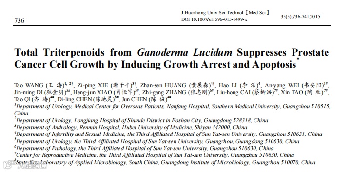 [1]王涛,谢子平,黄展森,等.Total Triterpenoids from Ganoderma Lucidum Suppresses Prostate Cancer Cell Growth by Inducing Growth Arrest and Apoptosis[J].Journal of Huazhong University of Science and Technology(Medical Sciences),2015,35(05):736-741.