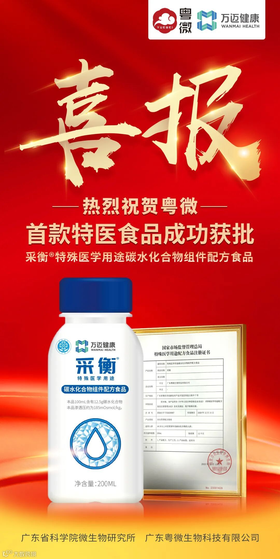 近日,粤微采衡®正式获得国家市场监督管理总局颁发的特殊医学用途配方食品注册批件,批准文号为国食注字TY20230067。采衡®是一款特殊医学用途碳水化合物组件配方食品。这是由粤微独立研制并获批的首款特殊医学用途配方食品!