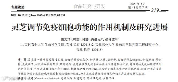[1]林志彬《灵芝的现代研究》. [2]Xu Wu ,jiliang Cao, Mingxing Li,Peifen Yao,Hongyi Li,Wendong Xu,Cheng Yuan,juyan Liu, Peng Li , Yitao Wang.An integrated microbiome and metabolomic analysis identifies immunoenhancing features of Ganoderma lucidum spores oil in mice. [3]谢文琦,韩雯,付璐,等.灵芝调节免疫细胞功能的作用机制及研究进展[J].食品研究与开发,2022,43(07):219-224.