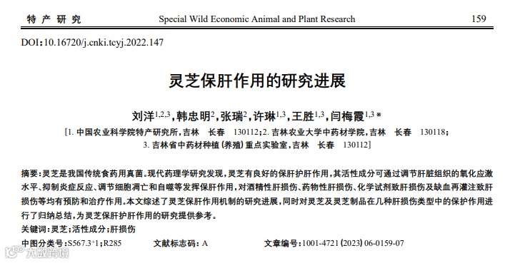 [3]刘洋,韩忠明,张瑞,等.灵芝保肝作用的研究进展[J].特产研究,2023,45(06):159-165.DOI:10.16720/j.cnki.tcyj.2022.147.