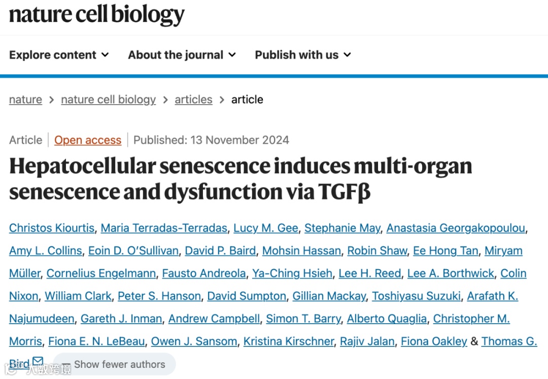 不仅如此,肝脏的衰老还可能会引发一场全身性的“连锁反应”。今年11月,Nature子刊上发表的一篇题为《Hepatocellular senescence induces multi-organ senescence and dysfunction via TGFβ》的研究文章,进一步证实了该观点。