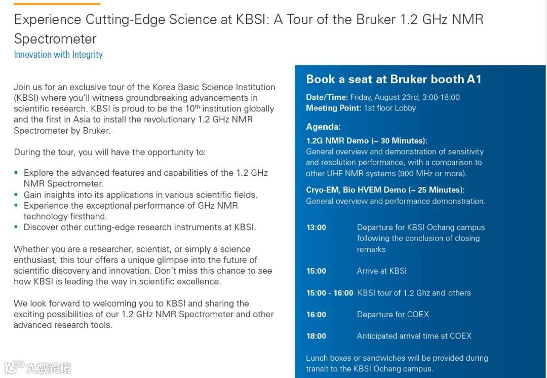 如果您想要参观这台全新交付的布鲁克1.2 GHz核磁共振波谱仪,请在8月23日前来布鲁克在本次ICMRBS大会的A1展台进行预约,详情见下图: