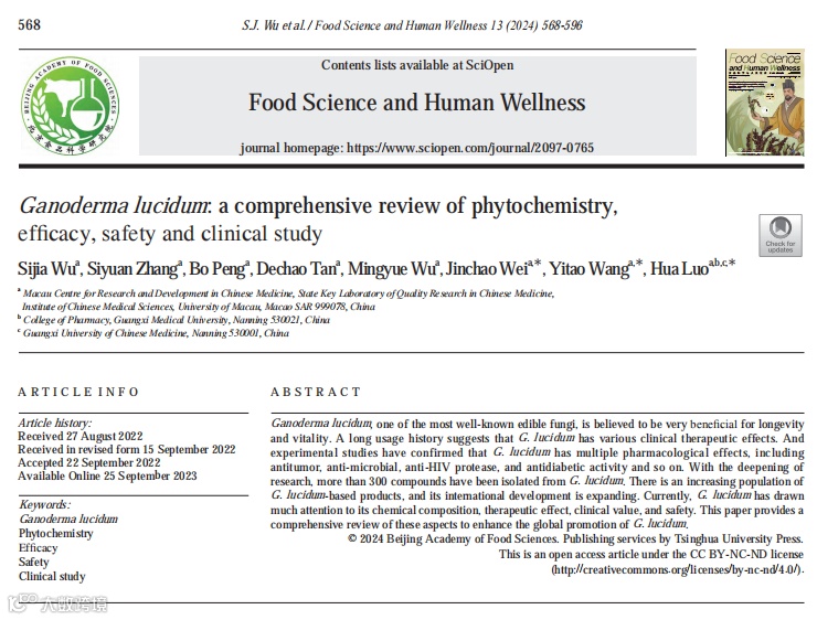 原文链接: WU S J, ZHANG S Y, PENG B, et al. Ganoderma lucidum: a comprehensive review of phytochemistry, efficacy, safety and clinical study[J]. Food Science and Human Wellness, 2024, 13(2): 568-596. DOI:10.26599/FSHW.2022.9250051.