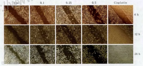 给予不同浓度的灵芝孢子油(0、0.1、0.25、0.5g/L)和顺铂(一种含铂的抗癌药物)注射液(10mg/L),观察比较不同实验组之前细胞迁移情况。