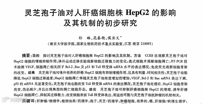 相关报告如下:南京大学医学院及国家生物医学技术重点实验室的孙琳等研究人员,通过CCK8(细胞增值实验)法观察灵芝孢子油对HepG2人肝癌细胞的增殖抑制作用。