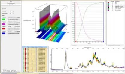 图3:OPUS光谱学软件中时间分辨快速扫描测量结果。左上角区域显示了FTIR光谱在反应时间过程中的变化,如3D图所示。右上角的区域显示了FTIR光谱中C-O和C-H键的峰值高度与时间的关系,用于监控反应速率。右下角区域显示了FTIR光谱图。