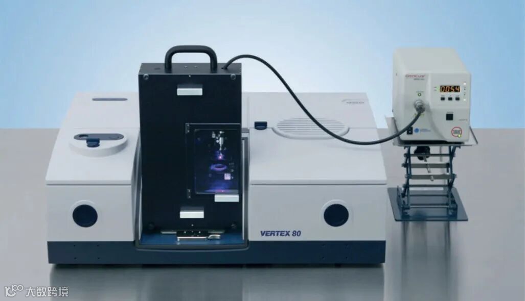 图2:紫外辐照Bruker VERTEX 80 FTIR光谱仪,光源位于右侧,样品仓内透射附件;