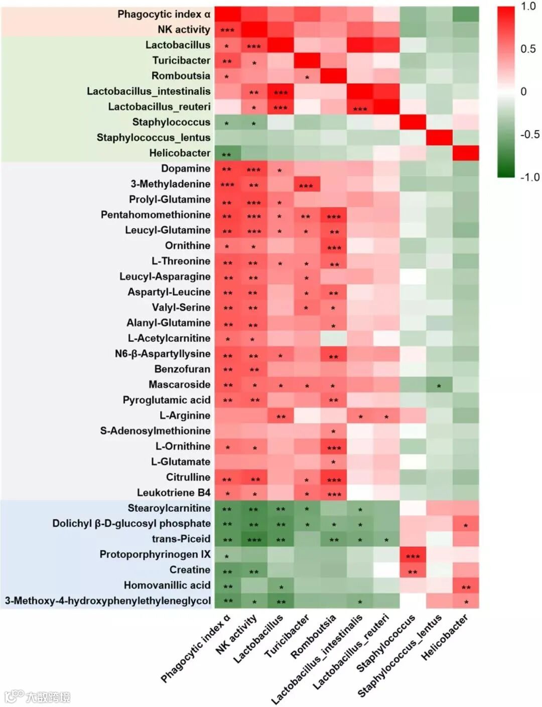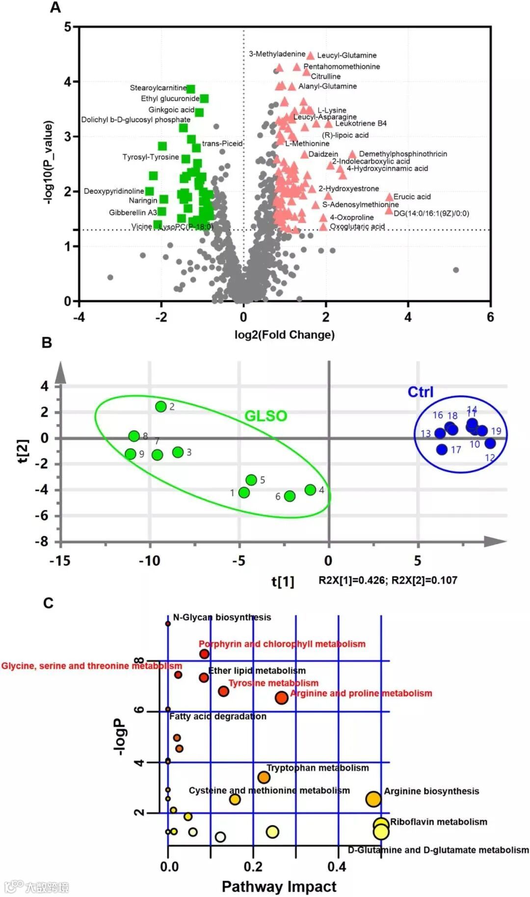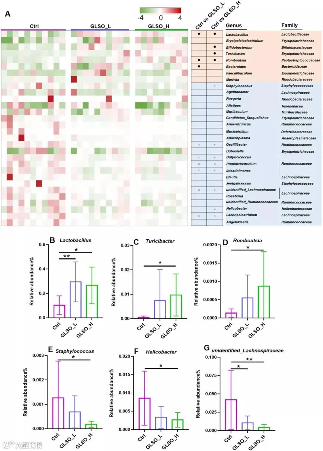 研究结果表明:GLSO增强了小鼠的巨噬细胞吞噬作用和NK细胞的细胞毒性。进一步的微生物组和代谢组学研究表明,GLSO引起肠道微生物群的结构重排,介导了多种代谢产物的改变。此外,GLSO引起了一系列关键代谢产物的调节,例如多巴胺,脯氨酰-谷氨酰胺,五甲基甲硫氨酸,亮氨酰-谷氨酰胺,L-苏氨酸,硬脂酰肉碱,二硫代β-D-葡萄糖基磷酸酯等。这些结果为人们了解GLSO对免疫系统的调节作用提供了新的见解。实验结果揭示如下: