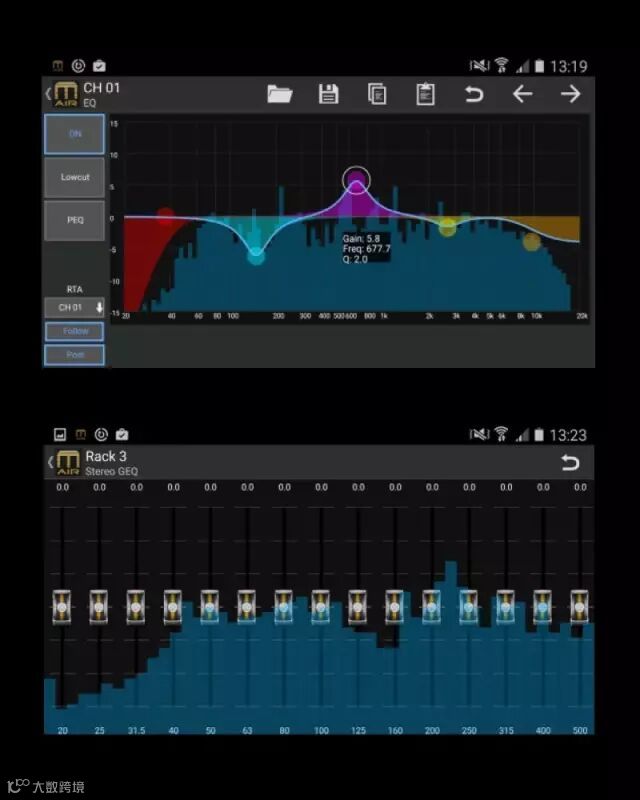 MR12内置高端的100段频带的实时频谱分析仪,所有输入输出通道的EQ页面具备完整的条形图和光谱RTA显示。另外RTA也可显示于GEQ页面,拥有MR12后对信号的监视和控制从此变得更容易!