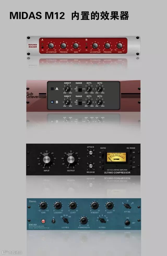 MR12内置了和M32一样的效果器处理引擎。效果器机架提供了4对立体声处理通道,可选择包括延时、混响、动态处理和GEQ等,并且不需要增加任何额外的硬件。