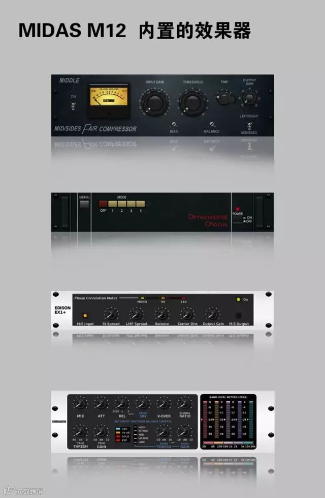 源于Midas 系列数字调音台的经典话放。同样应用于Midas M12,如今业内专业调音师及录音师均对Midas的音质给予高度评价。现在MR12同样集成了Midas 系列的经典话放,为其音质表现打下了坚实的基础。MR12附有4个Midas 系列经典话放,为使用者提供优质的效果体验。