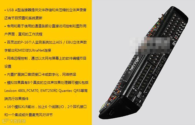 • 主输出、6个矩阵总线和所有16个混音总线每个都具有插入接口、6波段参量均衡器和全动态处理
