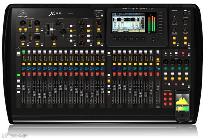 百灵达X32具备了市面上数字调音台的绝大部分功能,7寸的彩色大屏提供友好的操作界面。专用通道区设有17个背光的按钮以及13个带LED的旋钮,可对每个通道压缩器4频带均衡及众多的其他的细微差别之处进行调整。每个输入及输出通道区设有背光为128*64的图示LCD显示屏,以便可以快速了解重要的通道信息。