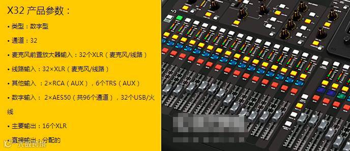 • 32 通道数字调音台配有16个混音母线,6个静音编组和8个DCA的编组