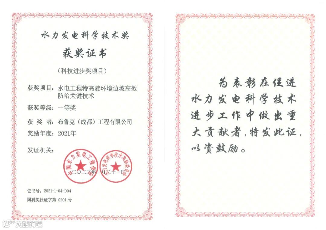 布鲁克公司与长江勘测规划设计研究有限责任公司,长江三峡勘测研究院有限公司(武汉),中国三峡建工(集团)有限公司,长江水利委员会长江科学院联合申报的《水电工程特高陡环境边坡高效防治关键技术》项目荣获水力发电协会“科学进步奖”一等奖。