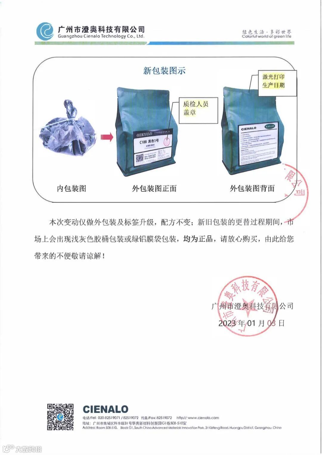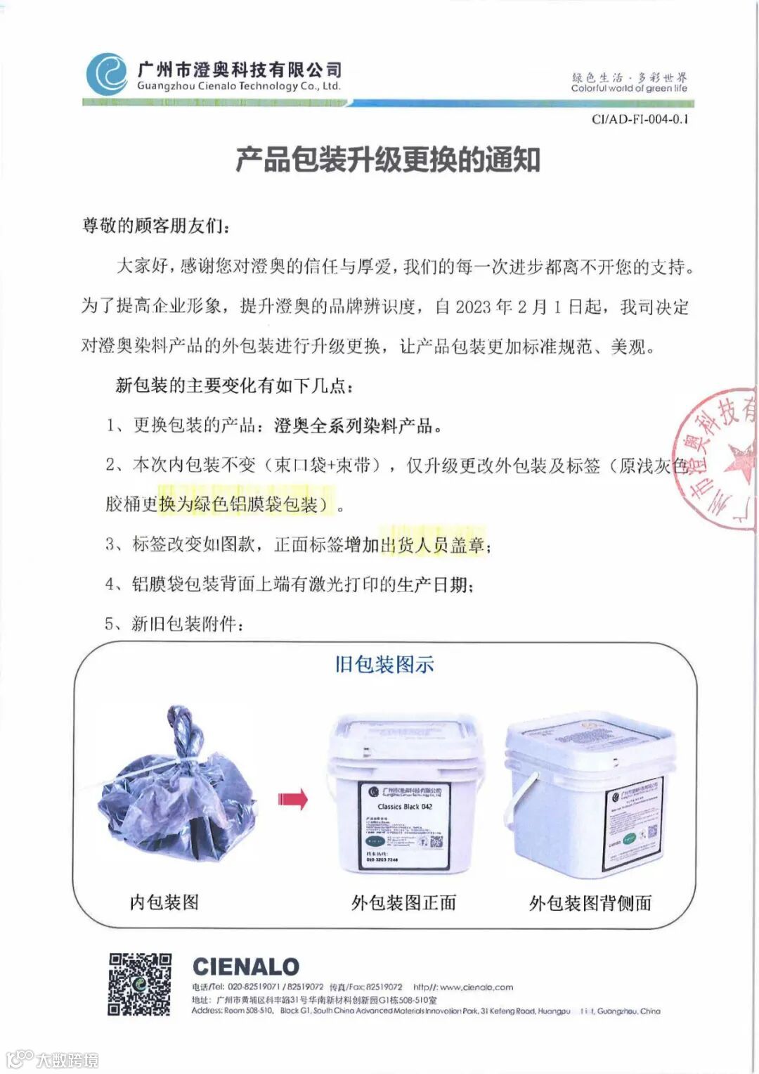 大家好,感谢您对澄奥的信任与厚爱,我们的每一次进步都离不开您的支持。为了提高企业形象,提升澄奥的品牌辨识度,自2023年2月1日起,我司决定对澄奥染料产品的外包装进行升级更换,让产品包装更加标准规范、美观。