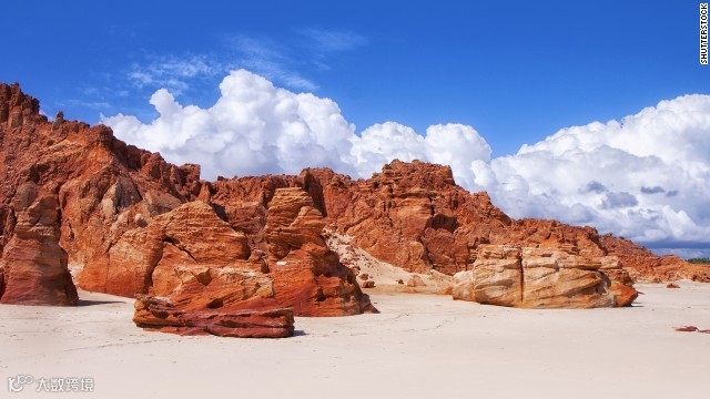 勒韦克角海滩,金伯利,西澳大利亚勒韦克角海滩坐落于西澳大利亚丹皮尔半岛的末端,离布鲁姆有将近三小时的车程,游人们可以在这独特的深红岩壁和洁白沙滩间尽享美妙的海岸假期。