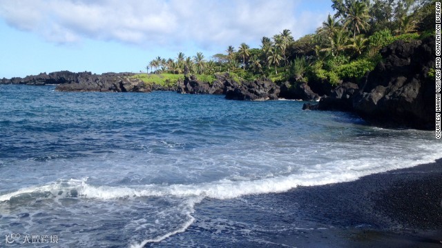 纳帕纳帕州立公园,毛伊岛,夏威夷这座黑色的沙滩位于纳帕纳帕州立公园内,被低矮的火山岩壁所包围。海滩也紧邻毛伊岛上著名的哈纳之路。