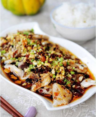 1.鱼洗净片成片,用盐、料酒拌匀腌几分钟,再加水淀粉拌匀码味。油炸花生仁剁成碎粒,豆豉剁碎,葱、蒜、姜切末。