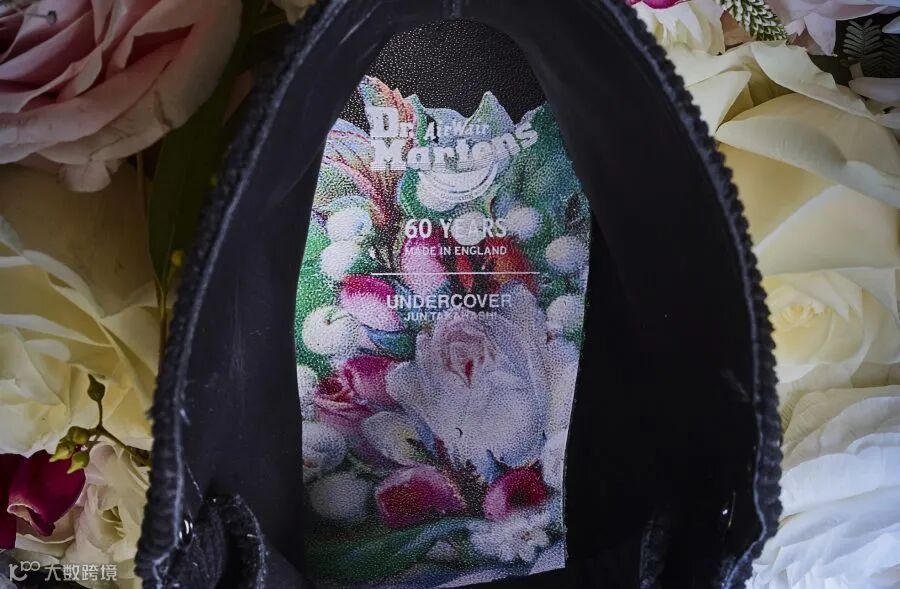Undercover 利用技术设计方法,创造了一次性的定制花束图案,并将其整合到靴子的内部。鲜花是庆祝活动的国际象征,因此他将它们印在衬里以及整个包装上。